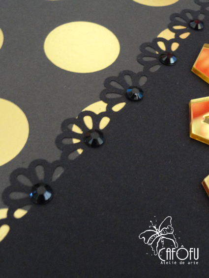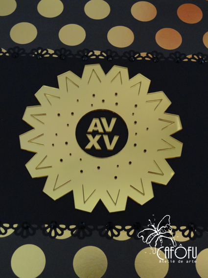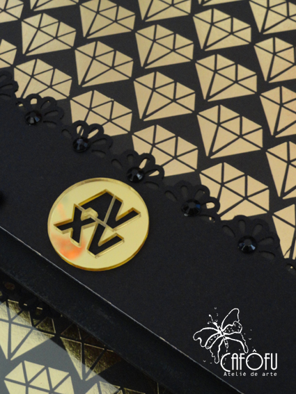 O convite, preto, dourado e rosa, tinha esse logo em dourado. Tive a ideia de mandar fazer dois: um maior para a caixa e outro menor para o álbum de assinaturas em adesivo espelhado dourado!