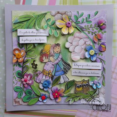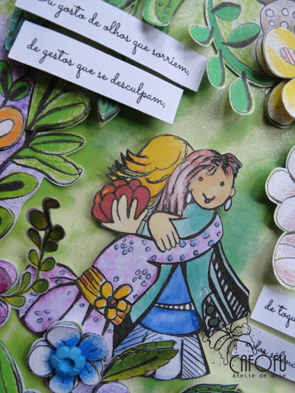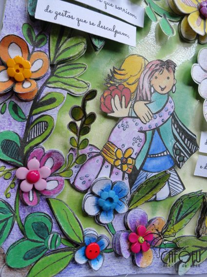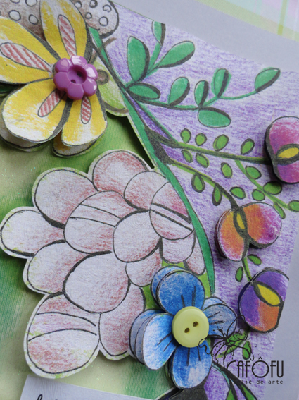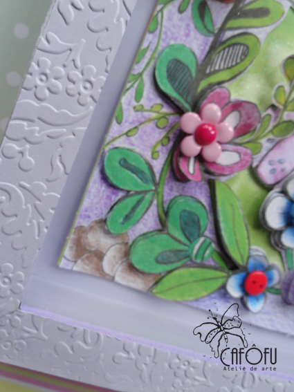 Os outros dois cortei alguns detalhes do desenho e fiz colagem em sobreposição para dar efeito relevo e apliquei botõezinhos com cores e formatos diferentes em cada miolinho das flores.