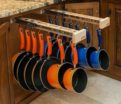 Guardar tampas de panelas, que ideia mais bacana. ganchinhos adaptados para tal fim! Aproveita o espaço perdido do armário e organiza todas elas divinamente. Clique AQUI.