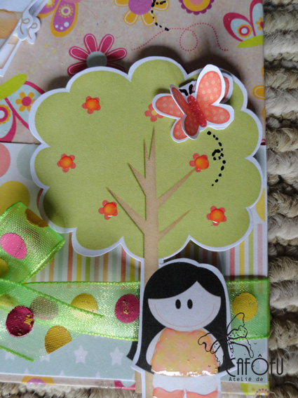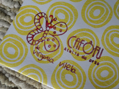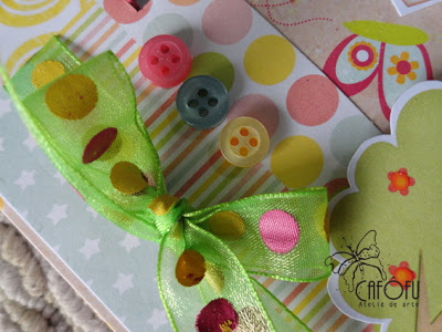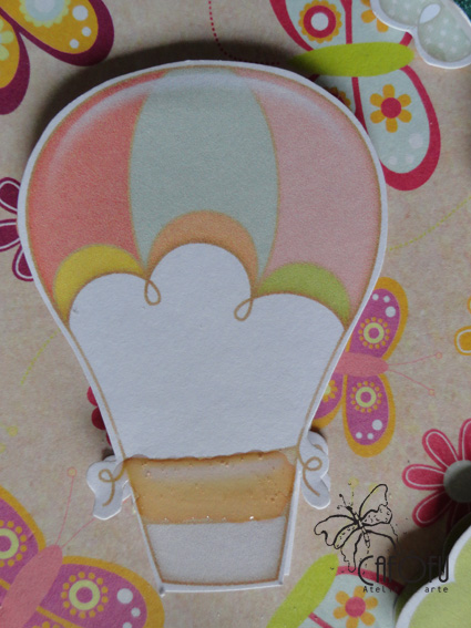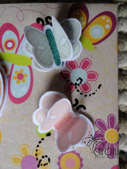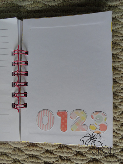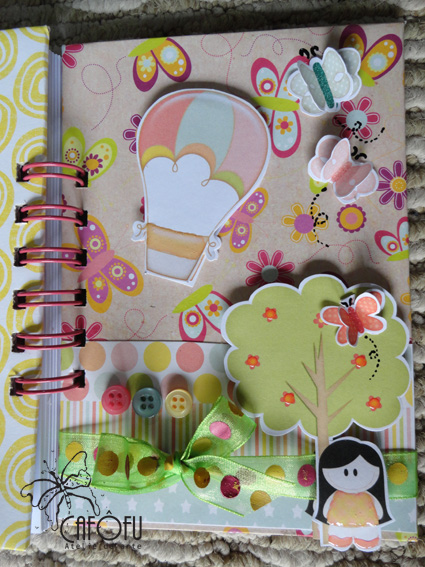 O miolo é pautado e capa é dura, feita com papel de scrap e colagem de botões, rendas e elementos digitais