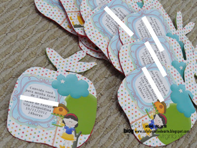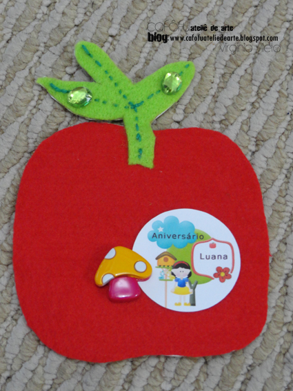 Convites lindos feitos com participação da vovó da aniversariante! Foi ela quem fez a maçazinha de feltro e eu, a arte digital do convite e aplicação dos enfeites!!!