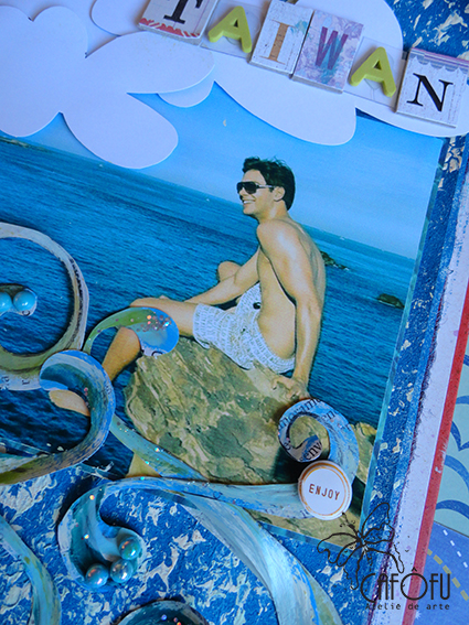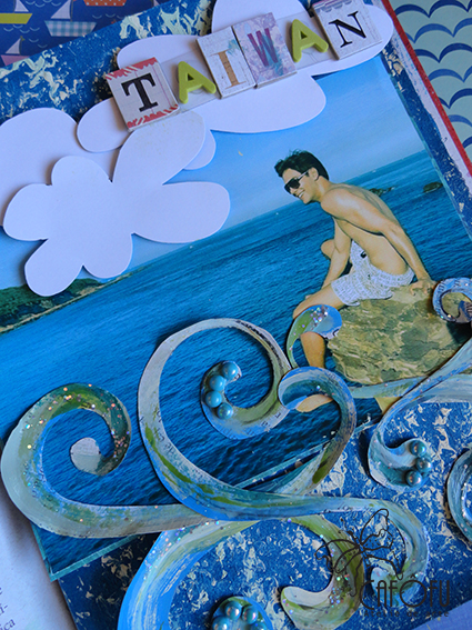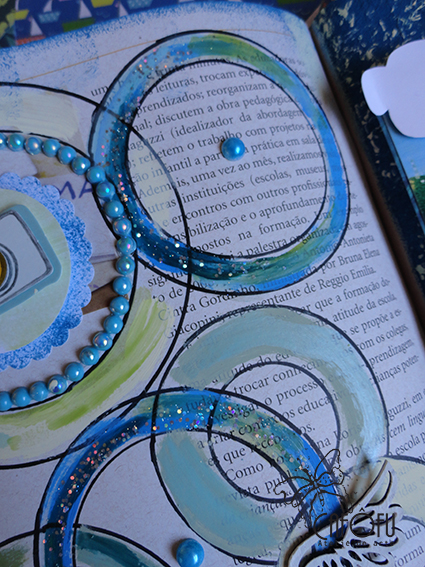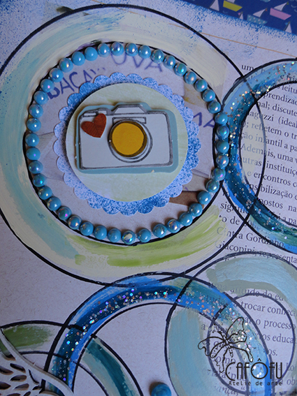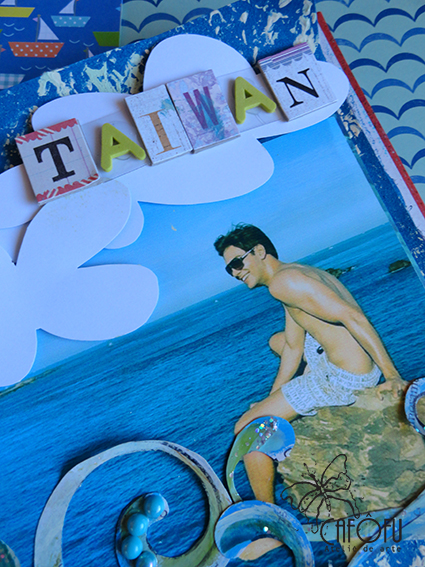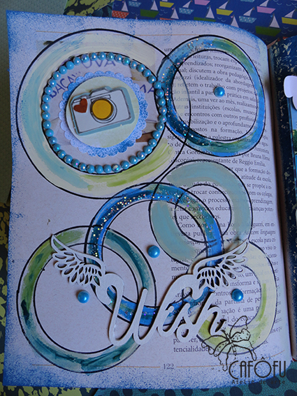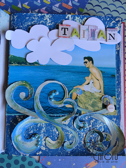 esmaltes, tintas acrílicas e PVA, moldes de chipboards, chipboard “Wish” da Momento Divertido, meia pérolas azuis de dois tamanhos da Bijoux Frufru, letras “Taiwan” recortadas, pedacinho de holler, pedacinho de acetato, pedacinho de papel de scrap, gesso, fita banana, dois tipos de furadores (escalope e circular), pincel, rolinho de textura, cola, fita banana, fita dupla face, caneta permanente.