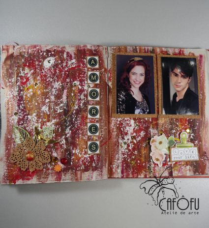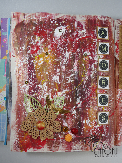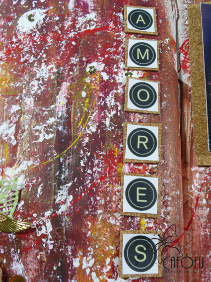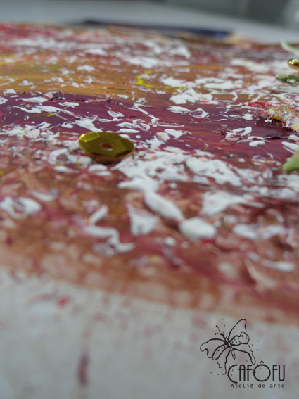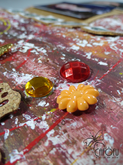 Depois respinguei bem a vontade cores que combinavam com as fotos: vermelho escarlate, sépia, vinho, amarelo ocre, amarelo primário, ferrugem.