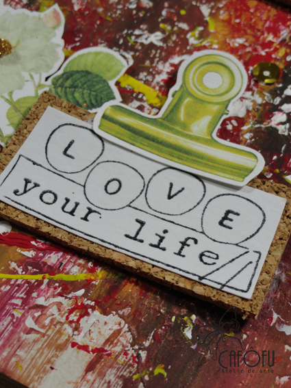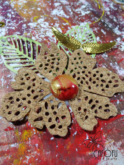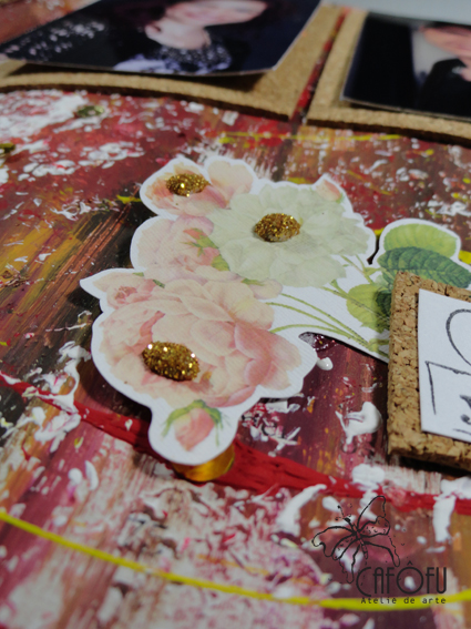 Usei cortiça também como tapetinho das fotos e um pouco de mais brilho (claro!) na flor de papel.