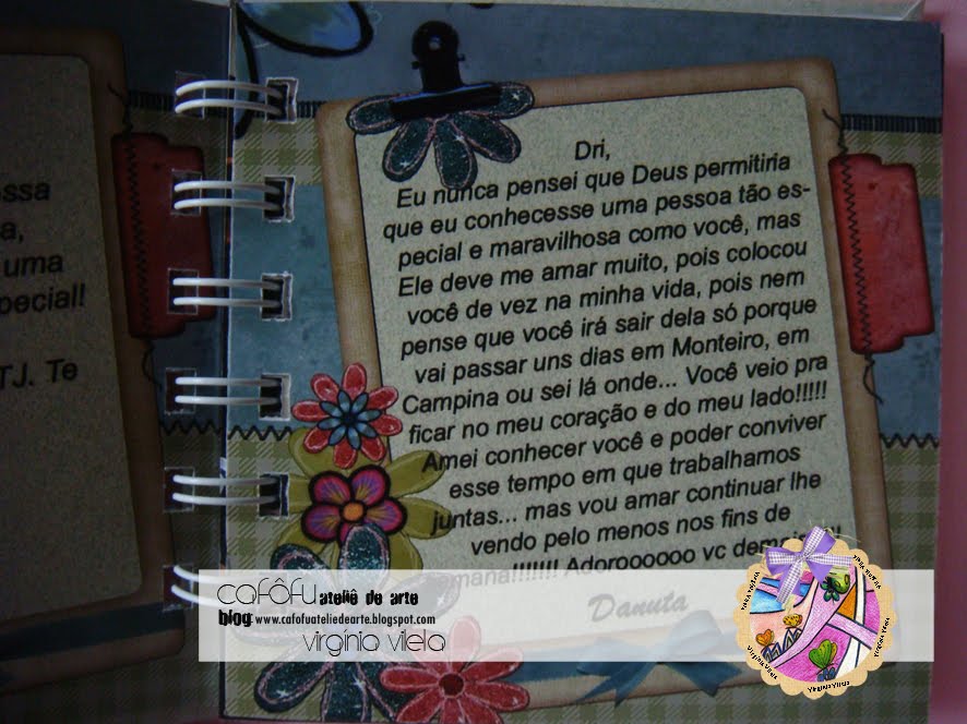 "Tava precisando de um presente pra uma amiga que estava mudando-se, foi quando vi um mostruário do trabalho da Virgínia e me apaixonei. Falei com ela, disse o que queria e deixei o resto pro conta dela, e qual não foi minha surpresa quando o álbum chegou e superou minhas expectativas, lindo, perfeito. Da pra notar o carinho em cada detalhe. Minha amiga amou e palavras dela: "foi o melhor presente que poderia receber". Então esta recomendadíssima. parabéns pelo trabalho. Bjoos"