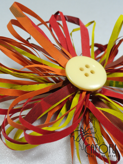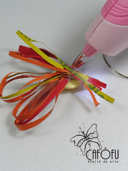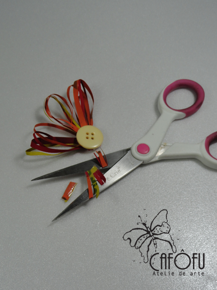 7- Escolha um botão grande que combine com as cores de tinta, de mais ou menos 2 cm de diâmetro e vá colando nele (do lado debaixo) as tirinhas com cola quente, uma a uma.