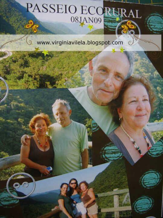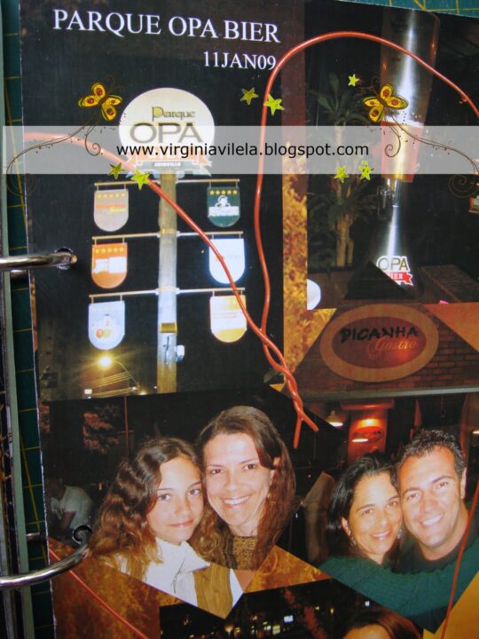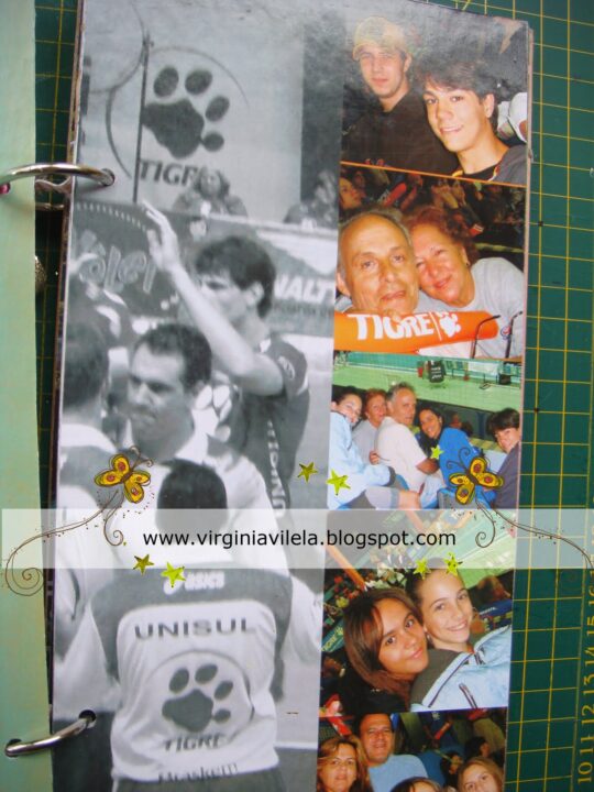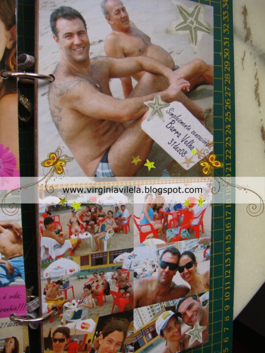 A capa plastificada e encadernada com argolas é de Scrapbooking híbrido, ou seja, tem também detalhes reais, como adesivos, molduras, botões, rendas, etc…