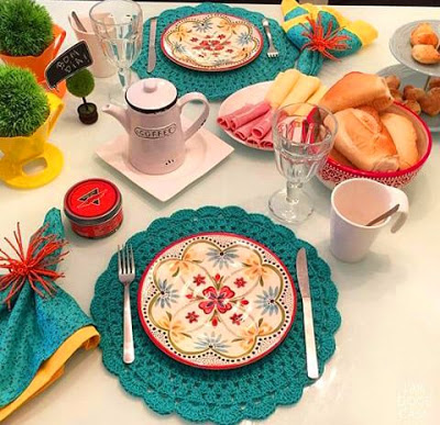 Um mesa de café da manhã cheia de amor! Com muito crochet, flores e comidinhas gostosas, frutas, bolo, pão fresquinho, café quentinho, chocolate pra lá de quente, geléia!