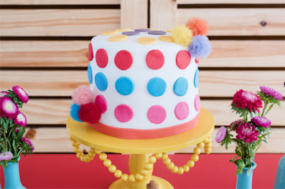 Olhem esse bolo! Simples e maravilhoso! Com pompons e em um suporte amarelo incrível!
