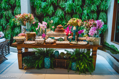 A mesa do bolo é uma mesinha, bem incomum, mas ficou uma graça!