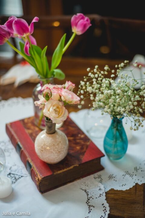 Toalhas rendadinhas, dessas que compramos bem baratinho em loja de festas decoraram a mesa dos convidados. Com vasinhos de formatos e cores diferentes enfeitaram perfeitamente!