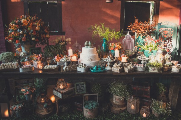 A mesa do bolo dos noivos a luz de velas cria um ambiente muito romântico.
