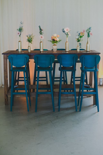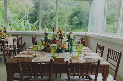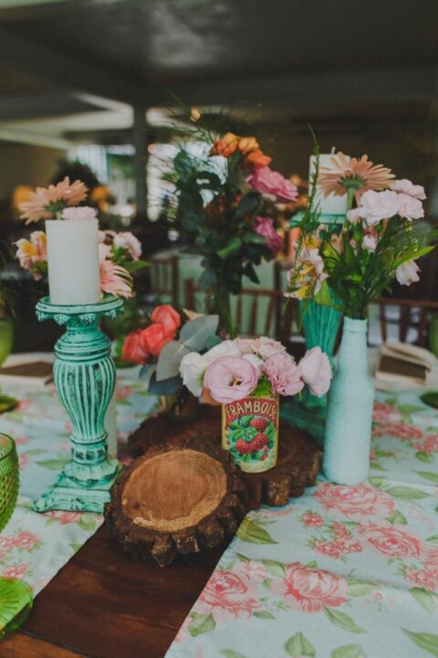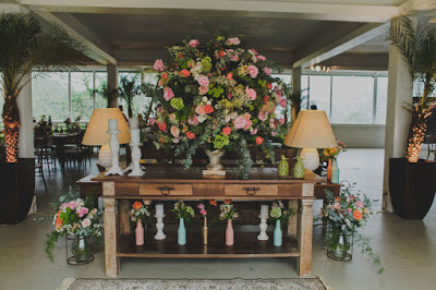 Olhem só essa outra mesa! Muitas flores, dois abajoures e garrafinhas coloridas!