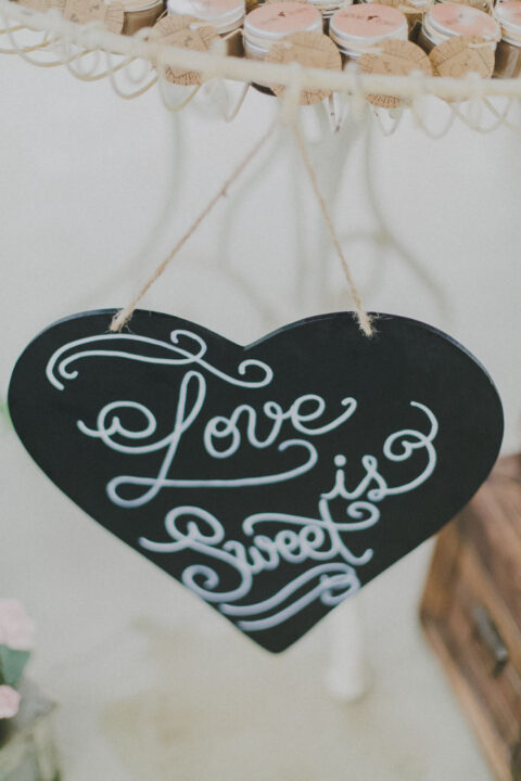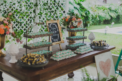 Uma das mesas externas: essa com alguns docinhos. Amei o quadrinho de coração no chão ajudando na decoração a cor tiffany tão usada hoje em dia e o quadro moldura em chalkboard!