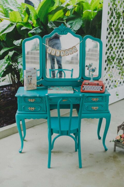 Em uma penteadeira azul tiffany antiga fica o caderno de assinaturas! Tem até a cadeirinha para o convidado se sentar e escrever a sua mensagem!