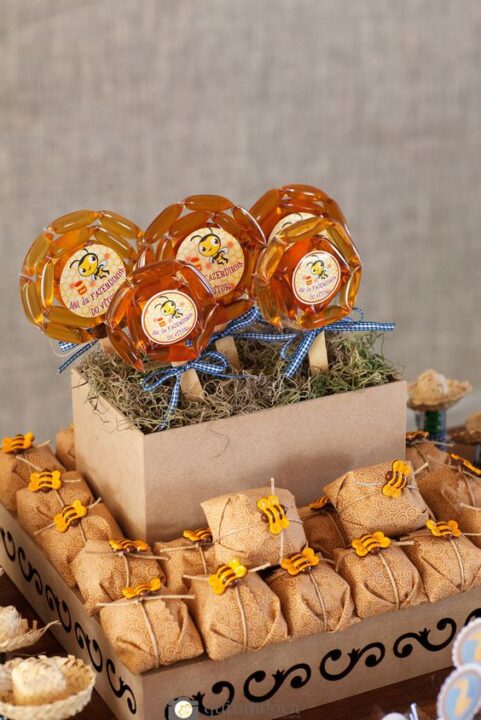 Balas em cestinhas feitas de palitos de picolé, plaquinhas de identificação, regadores e baldinhos.