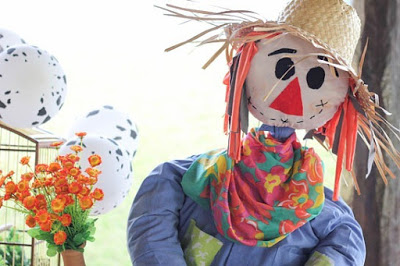 Um espantalho muito colorido num canto do salão enfeita lindamente a festa!