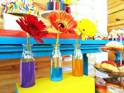 Jarros de plantinhas com água colorida, cada uma numa cor!