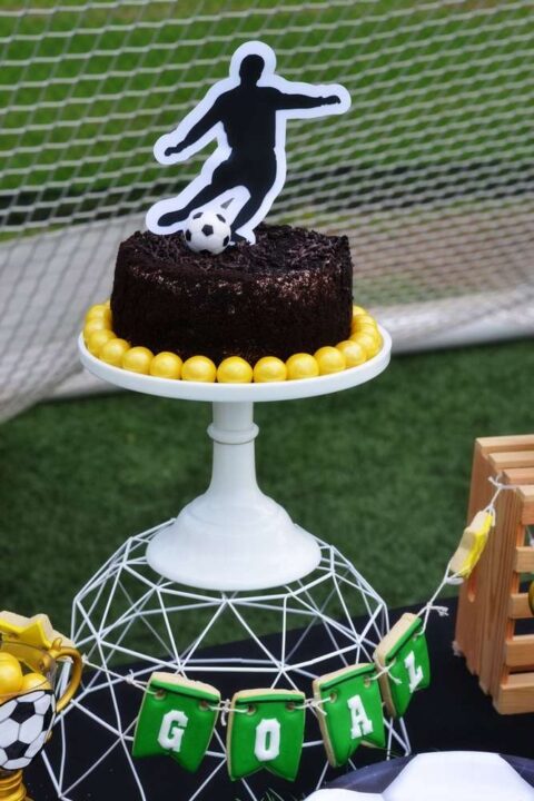 Que bolo mais lindo apoiado em uma vasilha que simula um troféu!