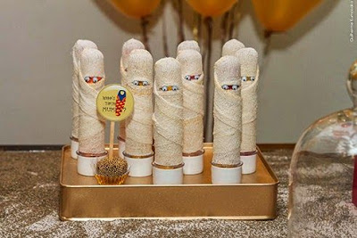 E esses baldinhos decorados com gazes desfiadas simulando fumaça de gelo seco. Incrível essa ideia!
