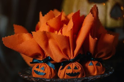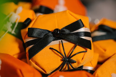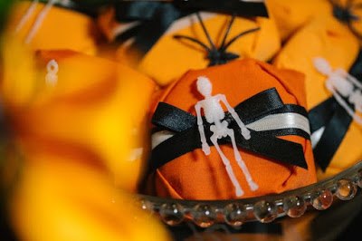 Achei muito lindo esses bolinhos de doce de leite decorados com fitinha, caveirinhas e aranhas!