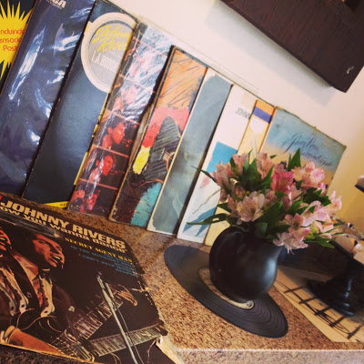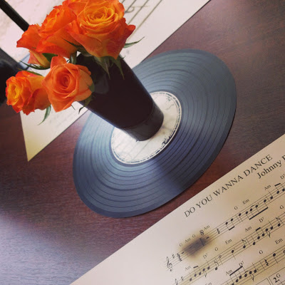 e para compor, flores com jogo americano – ao invés de um paninho de crochet, um disco vinil de verdade ou feito de papel…