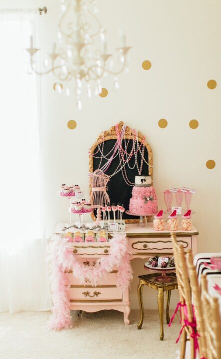 Plumas, cordões de bolinhas, móveis antigos, adesivos dourados enfeitando a parede atrás do bolo.