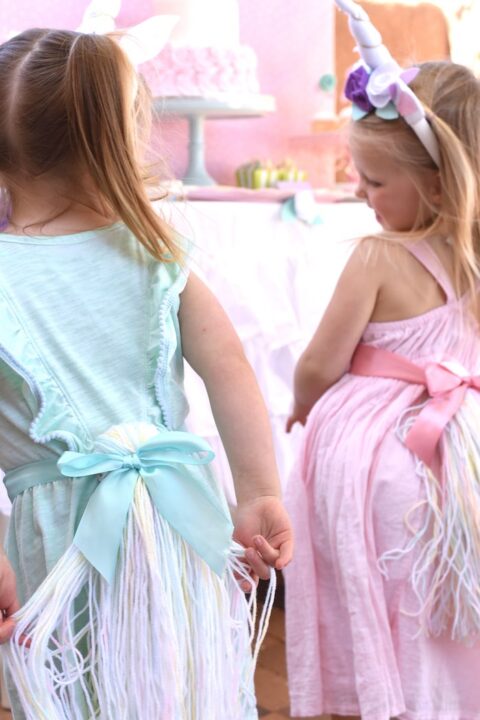 Para tudo!!!!! Olhem isso: a crina do unicórnio serve de decoração das cadeiras e as crianças a usam como fantasia!