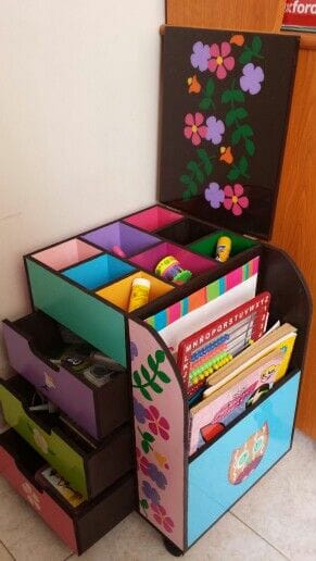 E que lindo isso: pendurar as cestinhas na parede e colocar as tintas dentro. Cada cestinha com uma cor! fofo demais da conta! Clique AQUI.