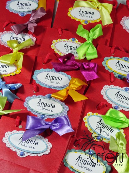 As embalagens da lembrancinha ficaram um charme! Cada sacolinha com uma cor de lacinho!