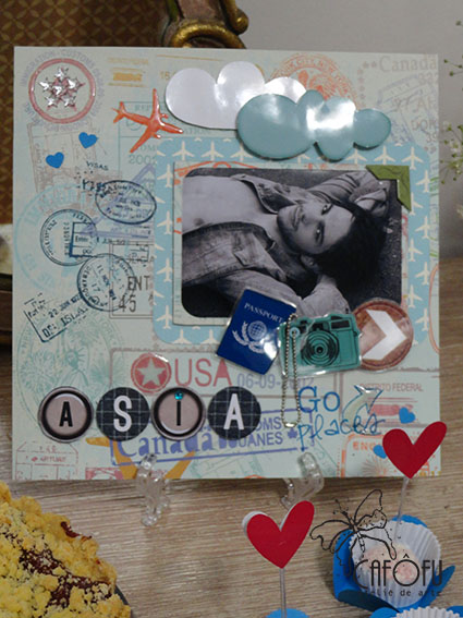 Fizemos uma página para decorar a “mesinha” com tema Viagem com carimbadas, relevos, verniz, plastificação na YourStory.