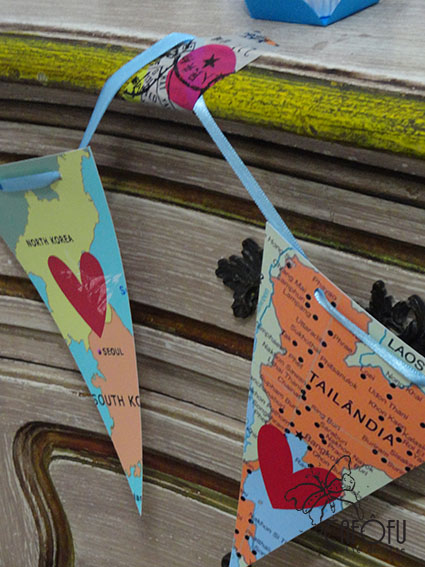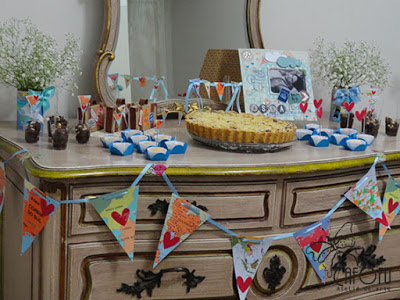 Bandeirolas para decorar a “mesa” e latinhas de leite condensadas recicladas para ajudar a decorar a mesa!