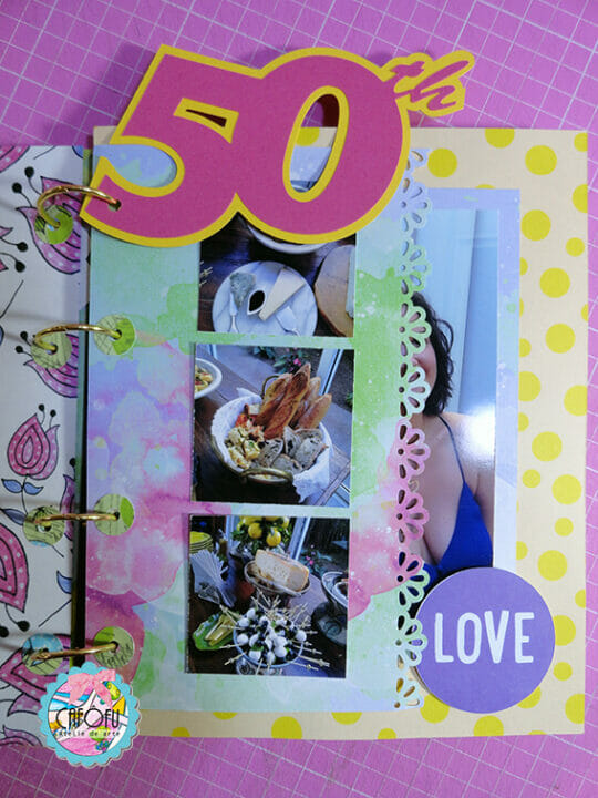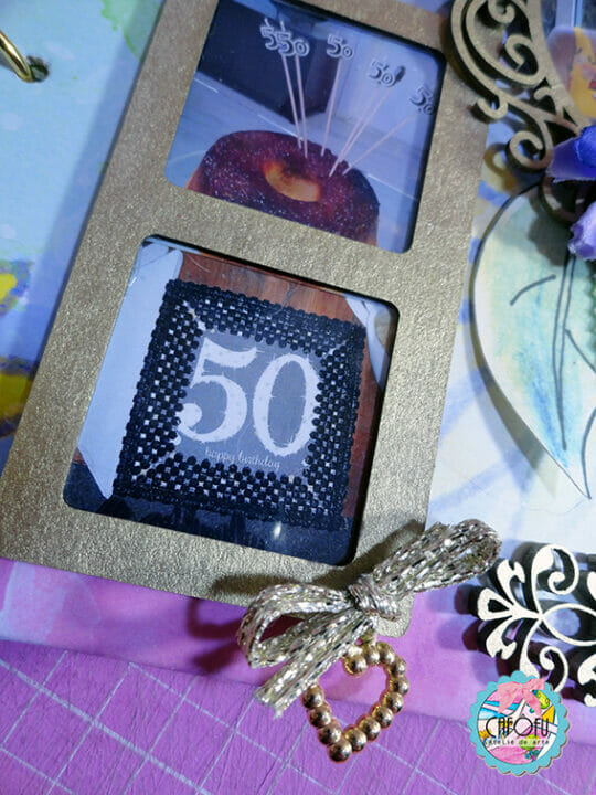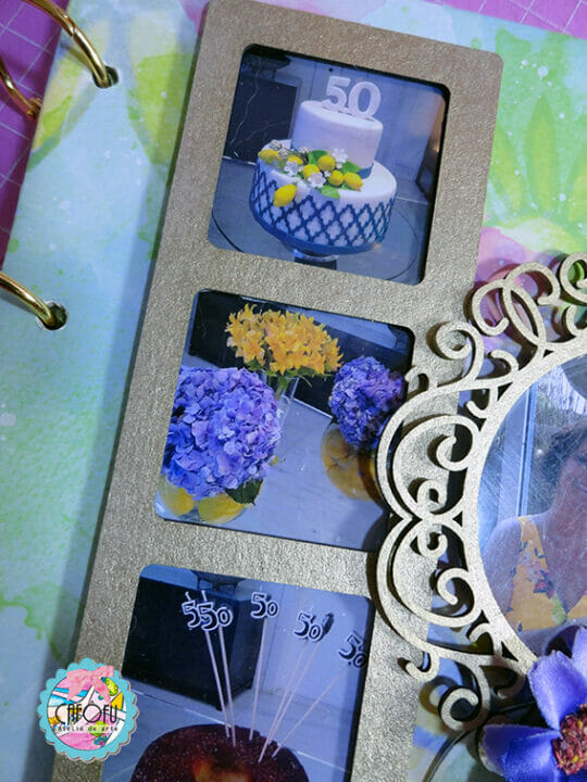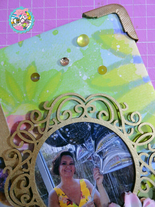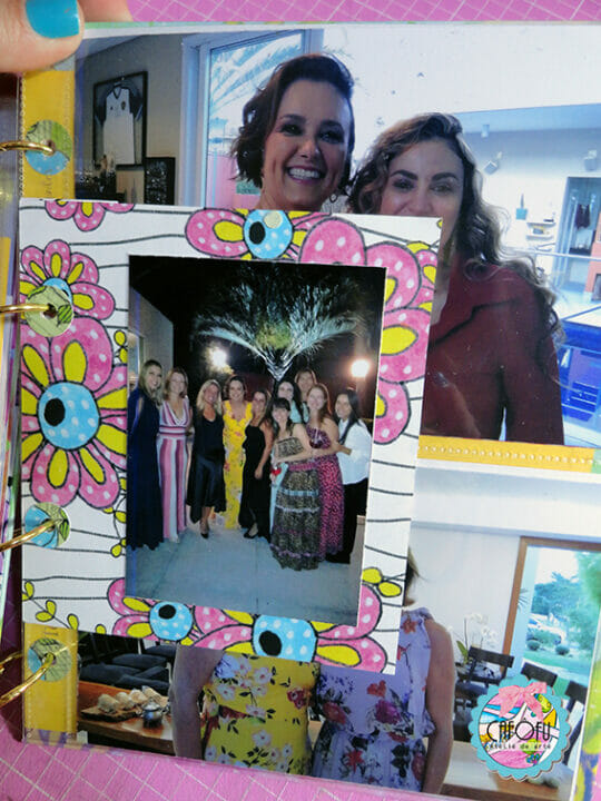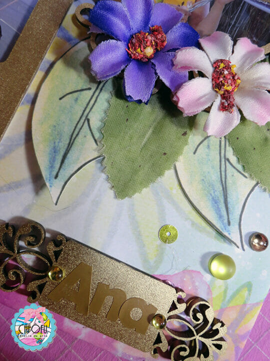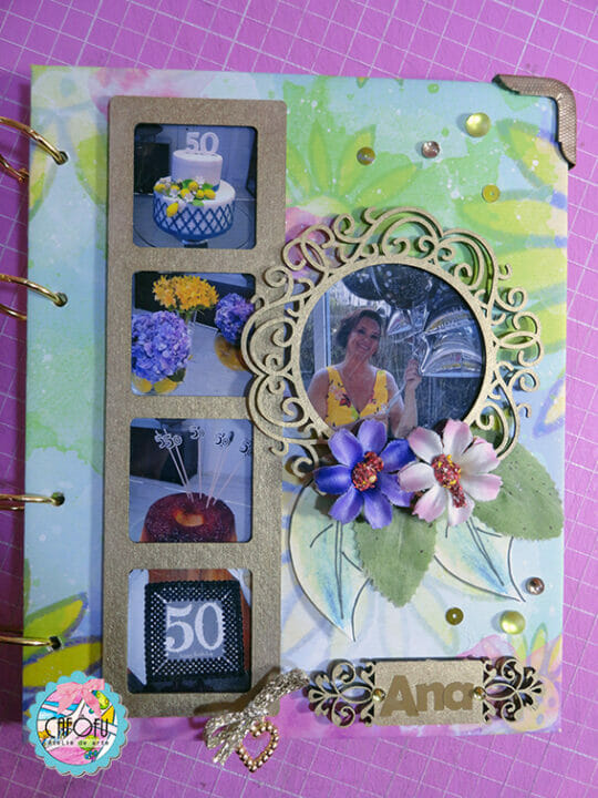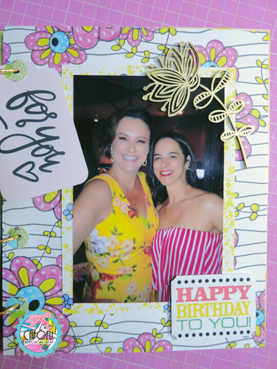 Decorei a capa do álbum com alguns chipboards da Momento Divertido e muitos bijoux frufrus!