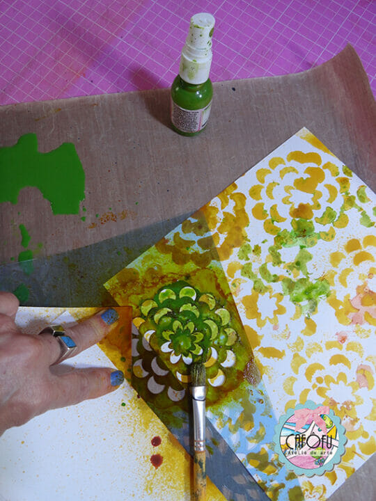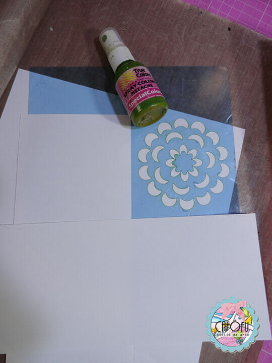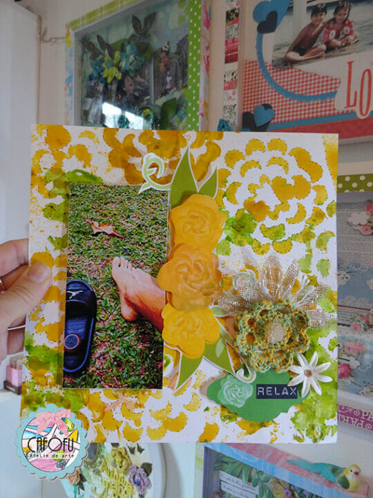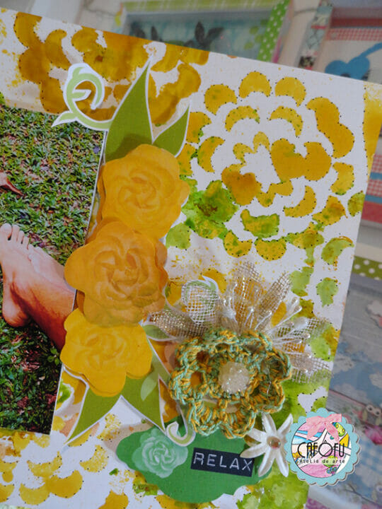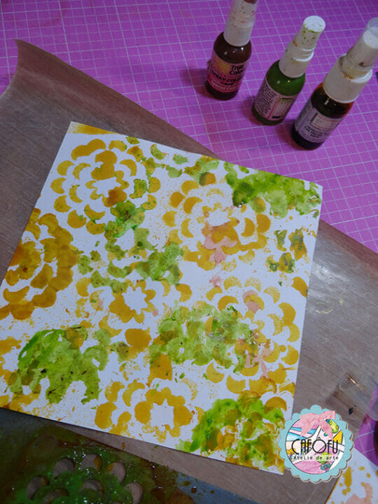 queria um efeito despojado, borrado, não muito certinho para combinar com a grama da foto e, por sorte, tenho spray verde, amarelo e marrom e um stencil lindão floral.