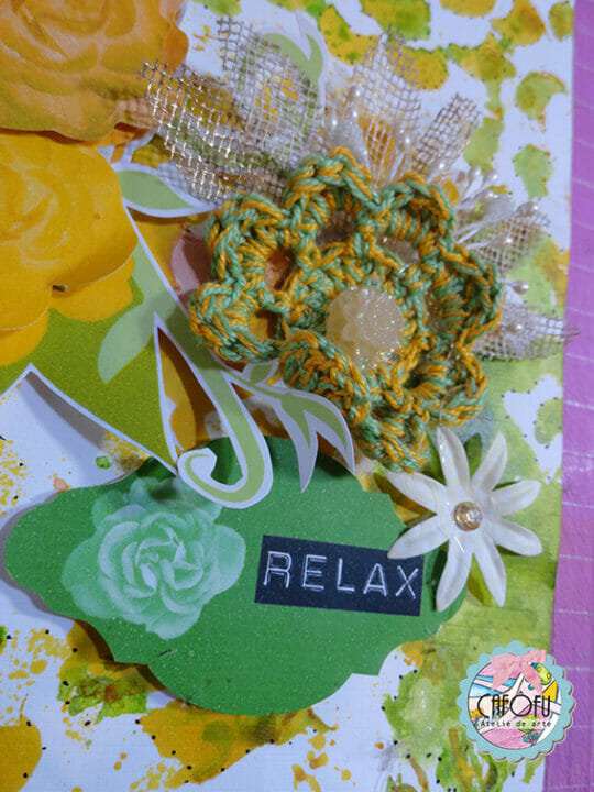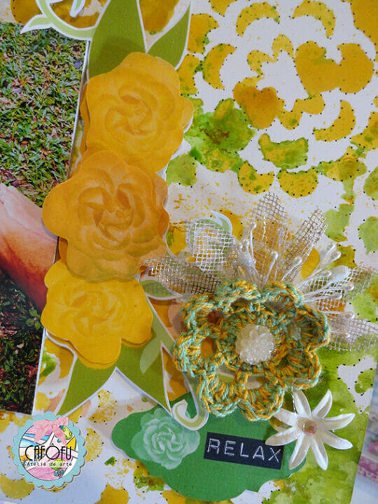usei flor de crochê tecida pela minha mãe, que faz parte da minha coleção BijouxFrufru para caprichar ainda mais na decoração do meu LO.