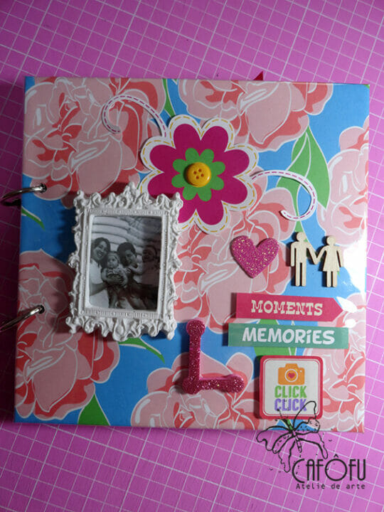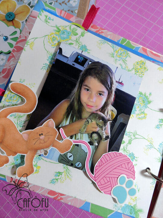Ficou muito rico de recortes e aplicações! 🙂 E a capa lindamente decorada e protegida com plástico.