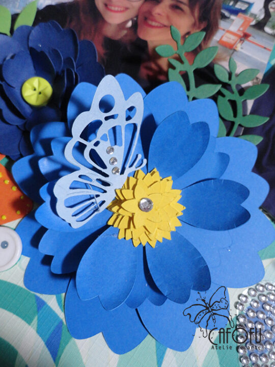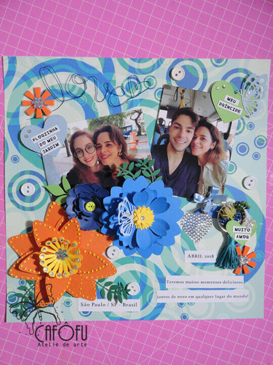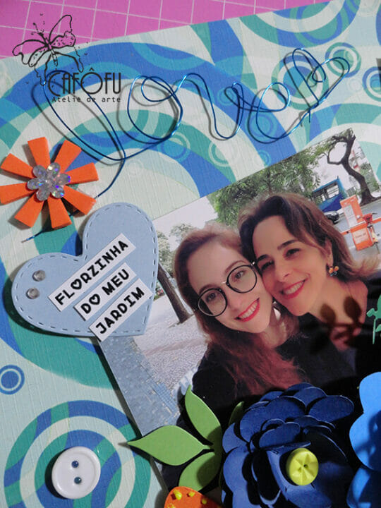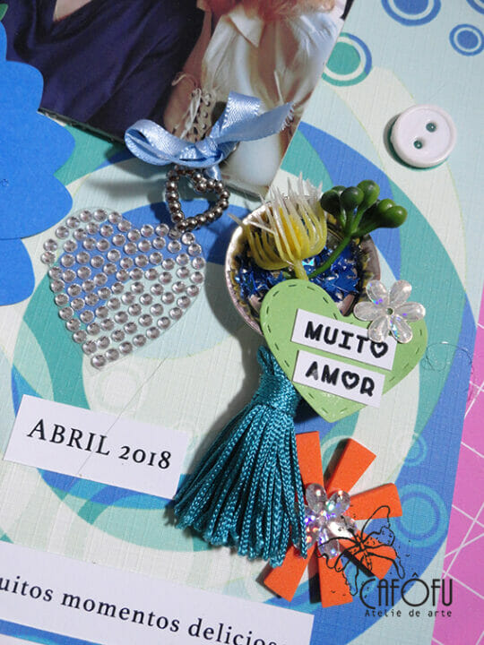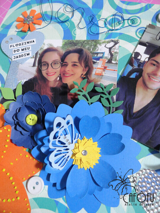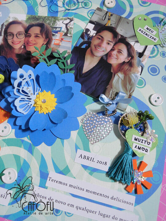 Usei diversos tipos de materiais na confecção dessa página: palavrinha de arame feita com a Happy Jig que ganhei da minha amiga Isaura! três arquivos da Silhouette de flores, faquinhas na minha Big Shot, botões, strass, apliques de EVA e de brilhos, hidromiçanga, tampinha de garrafa, tassel, cola quente, pinça, palitinho, dobradeira e base de EVA.