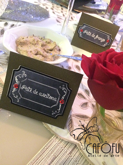 Como a festa era dourada, preta e vermelha, os tags marcadores de buffet foram feitos com papel dourado lindo de viver, com molduras em chalkboard, cada um de um jeito!