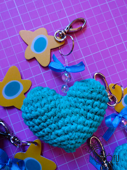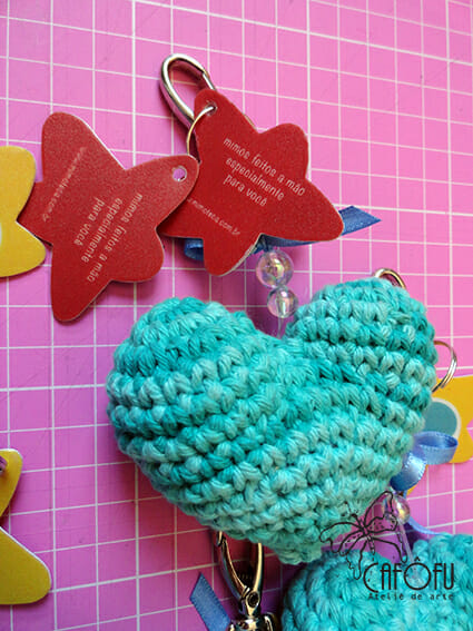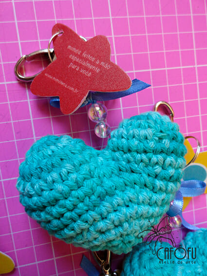 A empresa Mimoteca fez os coraçõezinhos em crochet e nós demos o acabamento para finalizar o chaveiro. É uma ótima opção de lembrancinha para qualquer ocasião.