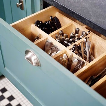 Gavetas com uma altura alta é muito legal – economizamos muito lugar para colocarmos os garfos, facas e colheres em pé.