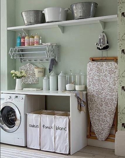 Que luxo essa lavanderia. sabão em pós guardado em vasilha de vidro, compartimentos diferentes para roupas sujas de materiais diferentes e um varalzinho que encolhe! Clique AQUI.