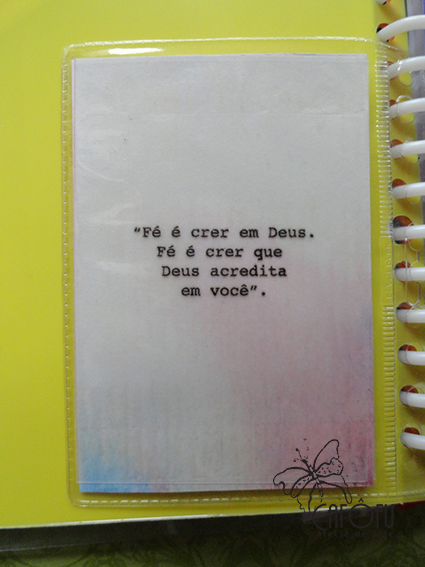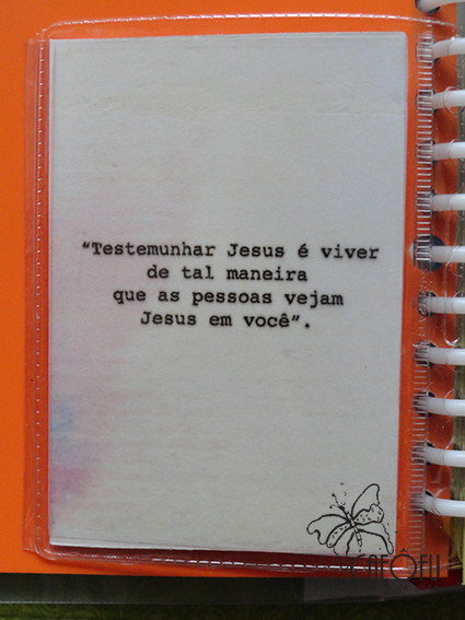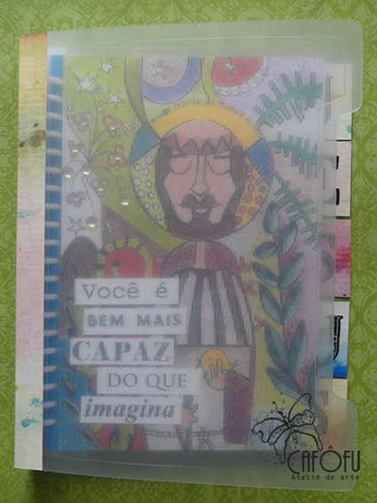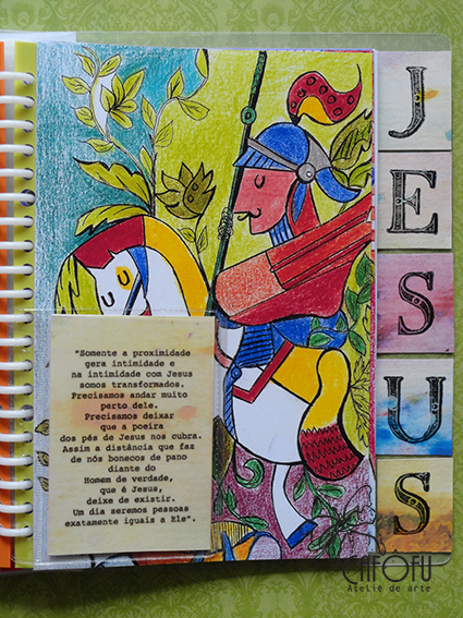 no quarto de capa do fichário colei uns quadradinhos carimbados com as letras para formar a palavra Jesus em papéis aquarelados também impressos feitos pela minha mãe.