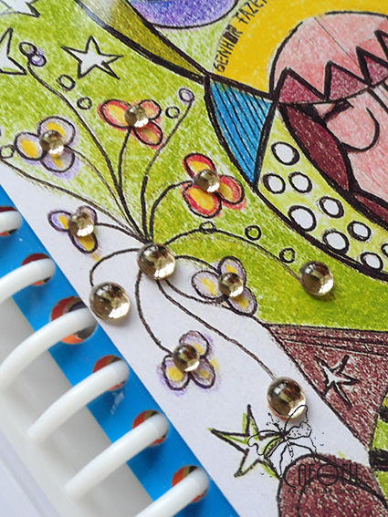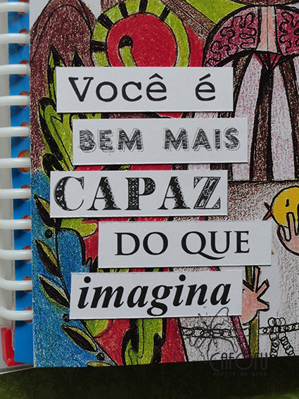 na primeira divisória, que ficou sendo a capa, colei a frase do pensamento em tirinhas com fontes diferentes em cada trechinho escolhido e uns brilhinhos nos miolinhos das flores.