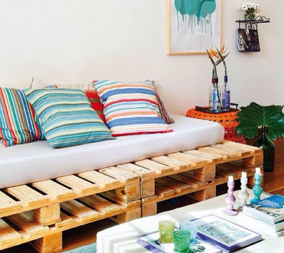 Esses pallets podem ficar muito legais. É só saber usá-los. Que tal colocar um colchão em cima e uns almofadões coloridos que o ambiente fica uma graça!