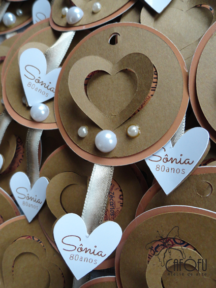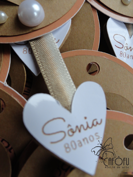 Com muitos frufrus: dois tags em um só, pérolas de dois tamanhos, fitinha degradê para festa de 80 anos!!!