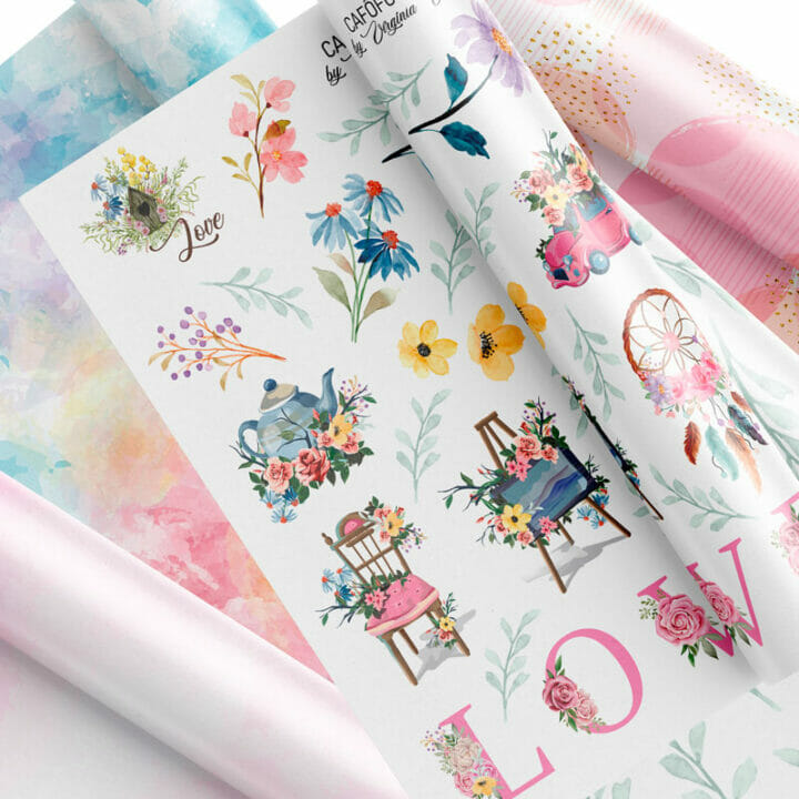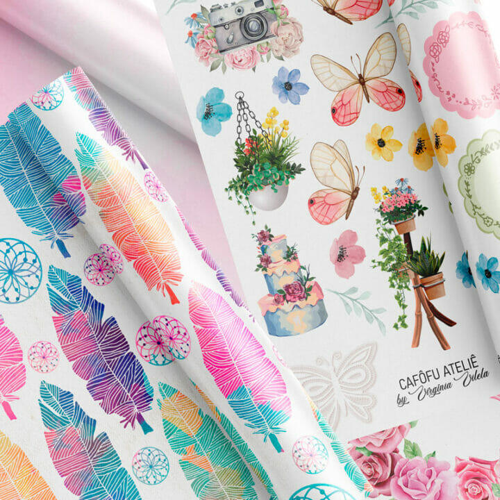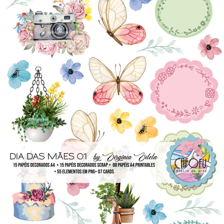 Conteúdo: 15 papéis a4 decorados, 15 papéis decorados scrap, 08 folhas a4 printables, 55 elementos em png, 07 cards + 4 moldes formato: papéis, moldes, cards e printables em jpeg, elementos em png.