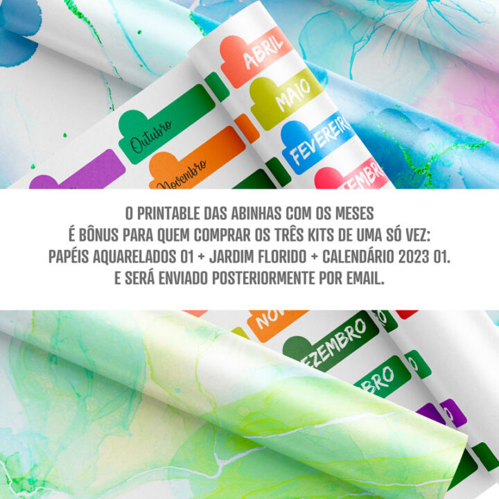 Observação: caso você compre ao mesmo tempo os três kits digitais calendário 2023 modelo 01 + jardim florido + papéis aquarelados 01 você ganha as abinhas dos meses em png e o printable das mesmas. Será enviado por email posteriormente.