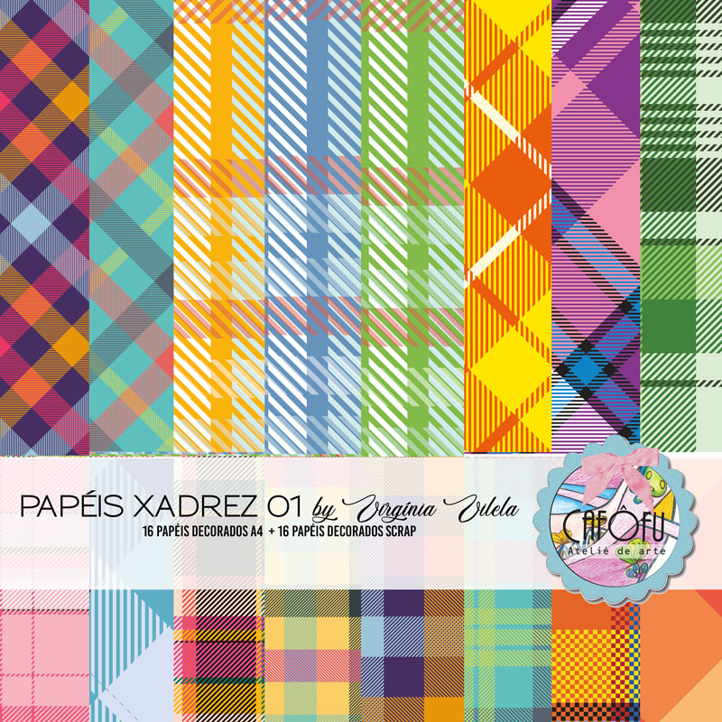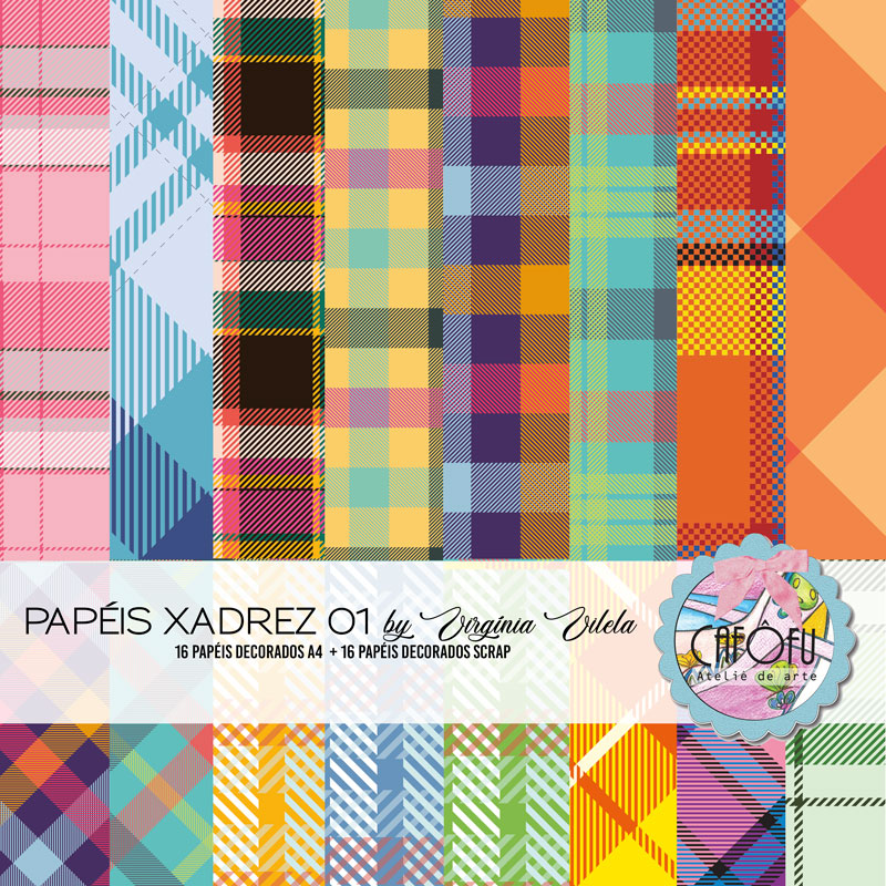 Conteúdo: 16 papéis digitais xadrez tamanho A4 + 16 papéis digitais xadrez tamanho scrap